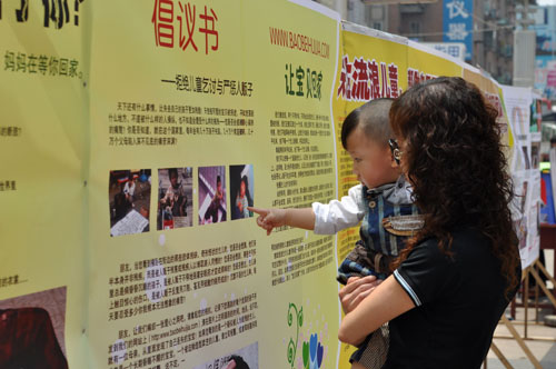 5月31日,由國(guó)內(nèi)知名民間公益團(tuán)體-寶貝回家志愿者協(xié)會(huì)與新?lián)釁^(qū)婦幼保健站、市公安局巡特警支隊(duì)、西三街電腦城、英特企業(yè)在線等單位聯(lián)合舉辦的“關(guān)注流浪兒童,幫助寶貝回家!”大型公益活動(dòng)在西四路步行街舉行。參加活動(dòng)的志愿人員通過展板、發(fā)放宣傳單等形式向過往行人宣傳了打擊拐賣婦女兒童的有關(guān)知識(shí)和未成年兒童自我保護(hù)注意事項(xiàng);同時(shí)也提請(qǐng)居民在出行中遇到兒童乞討及發(fā)現(xiàn)有意虐待兒童行為及時(shí)向公安機(jī)關(guān)報(bào)案。記者在采訪中了解到,近年來,兒童失蹤案件屢有發(fā)生,大多被拐賣兒童成為了行乞人員的贏利工具,為了騙取同情,甚至有意傷害兒童肢體造成殘疾,對(duì)兒童父母造成極大傷害,產(chǎn)生惡劣的社會(huì)影響。志愿者號(hào)召大家行動(dòng)起來,配合公安機(jī)關(guān)及婦聯(lián)、民政等部門,堅(jiān)決打擊拐賣兒童犯罪,動(dòng)員全社會(huì)力量,幫助丟失的孩子找到自己的爸爸媽媽。志愿者高瑞杰對(duì)記者說:“一個(gè)人的力量雖然小,但是大家團(tuán)結(jié)起來,自覺關(guān)注流浪兒童,選擇適當(dāng)?shù)霓k法去幫助這些孩子,就會(huì)讓犯罪分子沒有利益可圖,最終無法繼續(xù)進(jìn)行犯罪活動(dòng)!